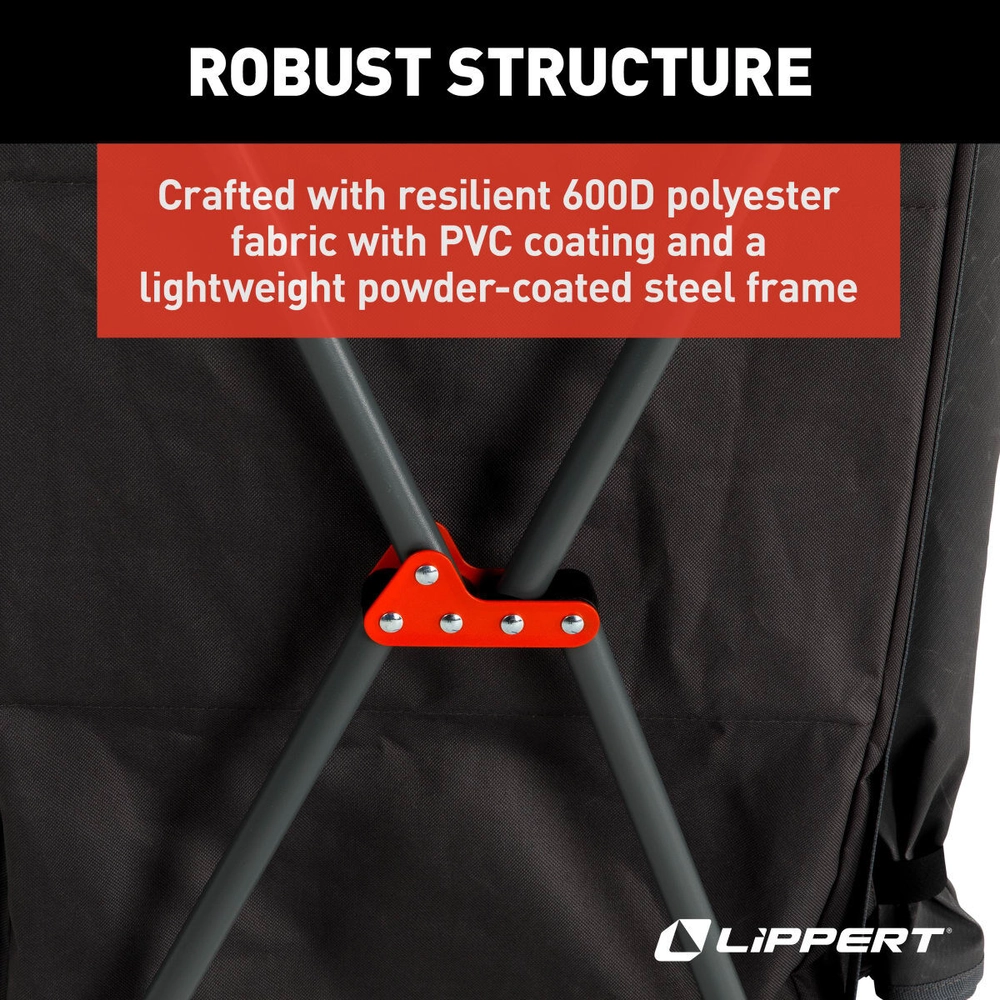 The Lippert camping pantry offers outdoor enthusiasts a perfect blend of durability and versatility. With a powder-coated aluminum slat top, resilient 600D polyester fabric and a collapsible design, it provides ample storage for essentials, with a swift setup and effortless portability.